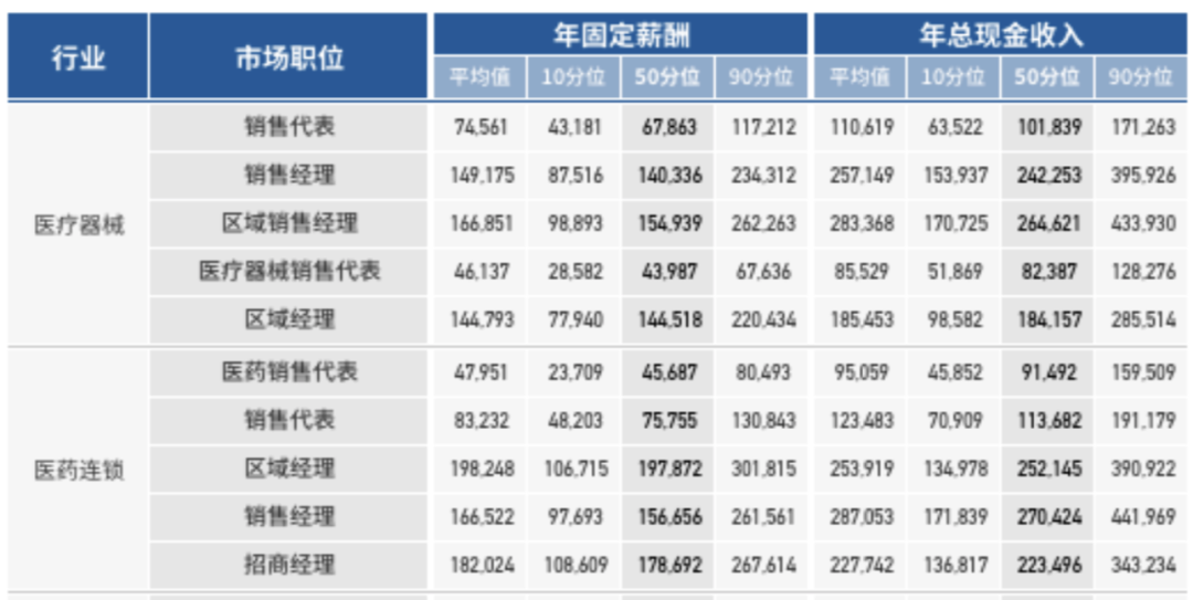 根據(jù)報告,醫(yī)療器械和醫(yī)藥銷售代表的年固定薪酬方面有所不同。就醫(yī)藥連鎖行業(yè)來說,醫(yī)藥銷售代表的年固定薪酬平均值為47951,年總現(xiàn)金收入的平均值為95059,年固定薪酬中端水平為45687,年總現(xiàn)金收入的中端水平為91492。