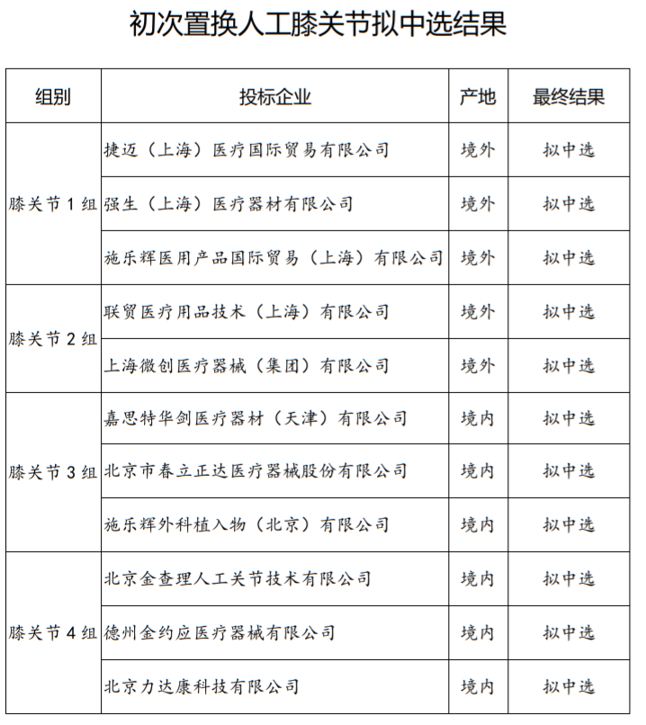 初次置換人工膝關(guān)節(jié)擬中選結(jié)果涉及強(qiáng)生、捷邁、施樂輝、上海微創(chuàng)等11家械企,在此之前,共24家械企符合申報(bào)條件;